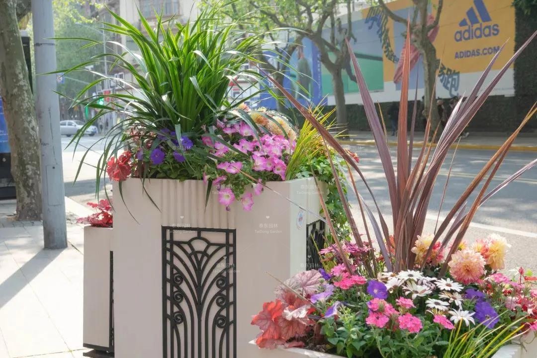 淮海中路花箱選用龍血樹、紅巨人朱蕉、金鉆,搭配小麗花、南非萬壽菊、矮牽牛、礬根、常春藤等,呈現(xiàn)出和諧而繽紛的植物色彩,為繁華時(shí)尚的商業(yè)氛圍增添一份清新靚麗的自然美感。