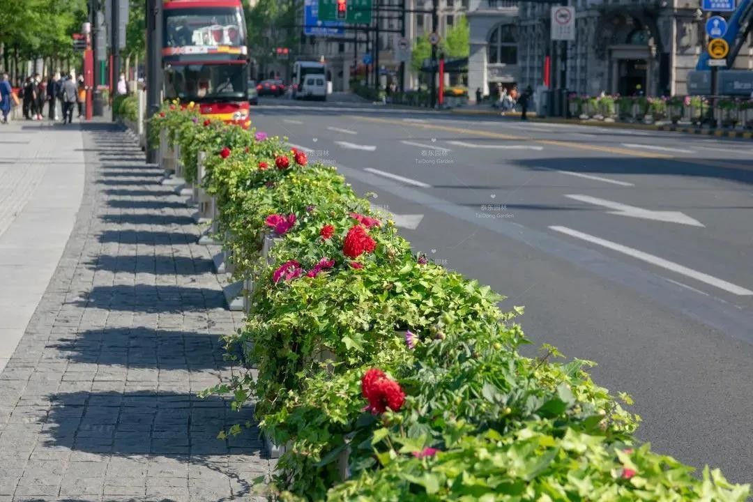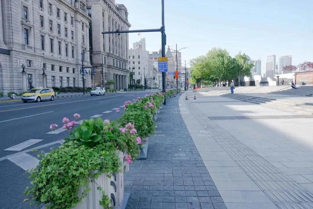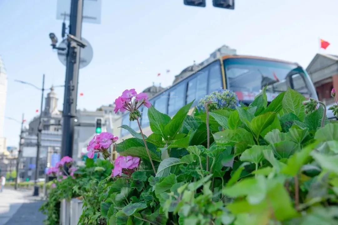 外灘花箱選用紅色及紫色大麗菊,或藍(lán)色繡球無盡夏搭配粉色天竺葵。現(xiàn)大麗菊及繡球花正含苞待放,漸入佳境。